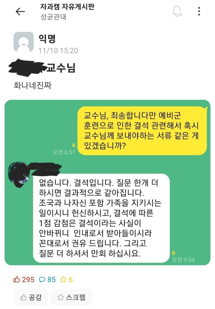 지난 10일 대학생 익명 커뮤니티. 9 hours ago성균관대학교의 한 교수가 예비군 훈련 참석으로 수업에 빠진 학생을 결석 처리했다는 주장이 나왔다논란이 일자 대학 측은 교수가 해당. 성균관대 관계자 출석 인정 협조 공문 발송했는데 인지 못 한 듯 10일 대학생 익명성 커뮤니티 에브리타임 성균관대학교 자유게시판 갈무리.